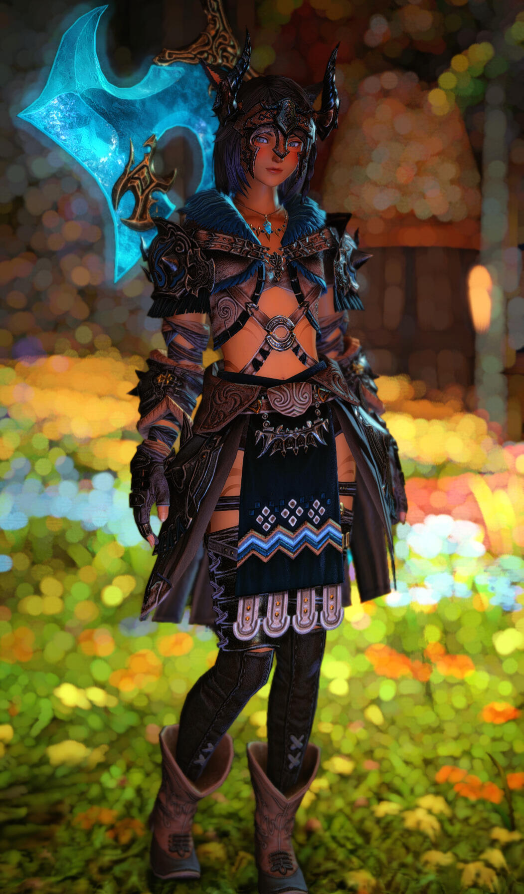 Rukh is often dressed in shades of brown, red, and beige, favoring sensible clothing over the fine and fashionable. If meeting in the wilds you would likely find her in leather armor, an Ihuykanite axe on her back, and wearing a horned helm that shows she has passed the trials associated with being recognized as a warrior of her people.