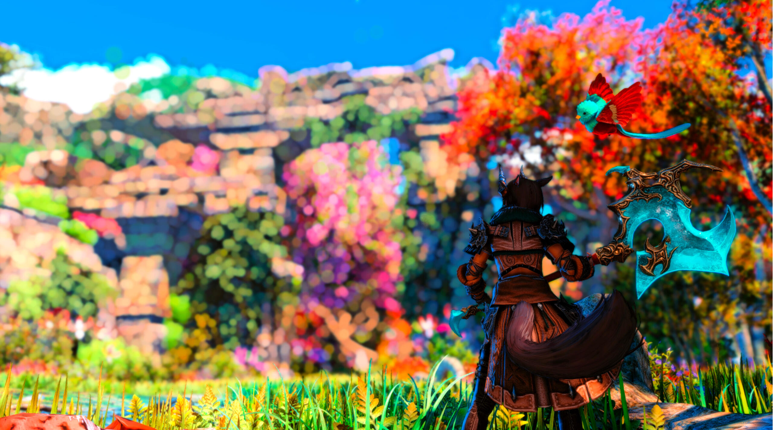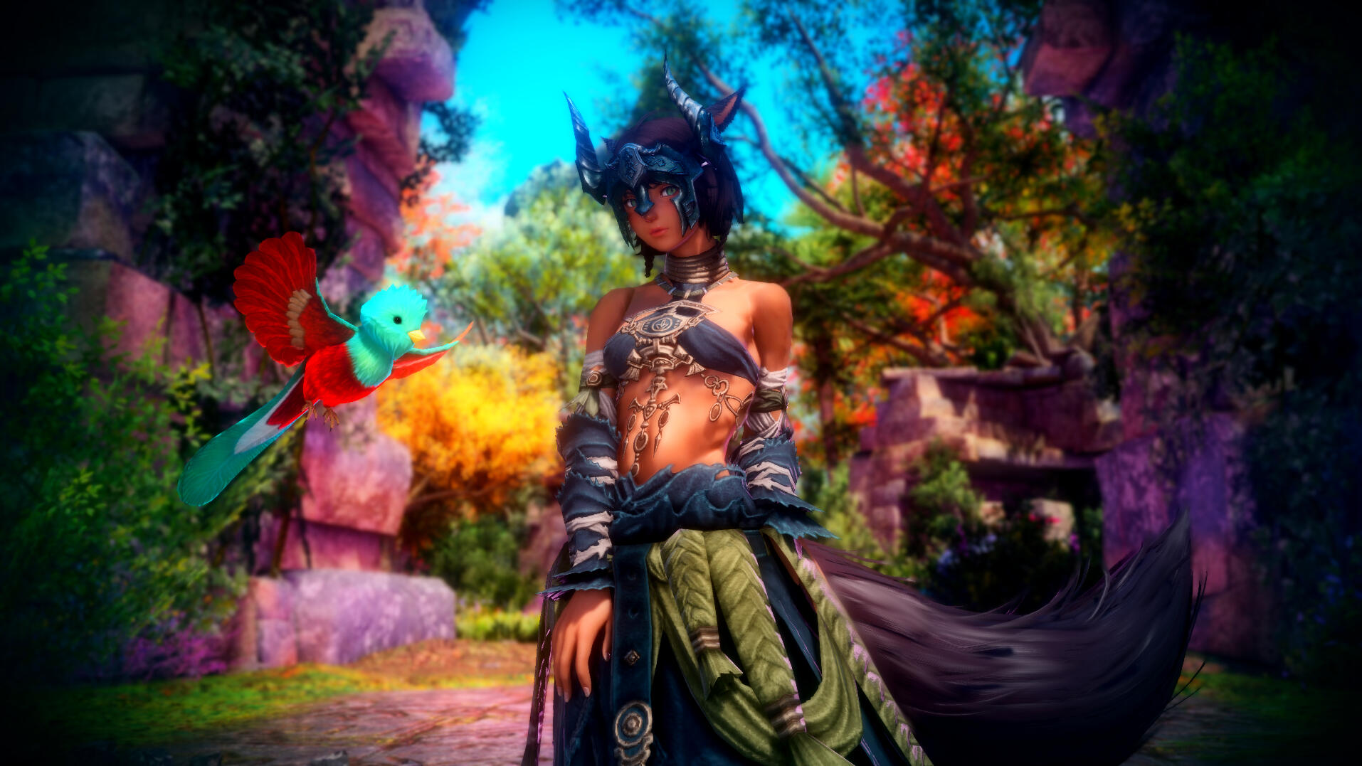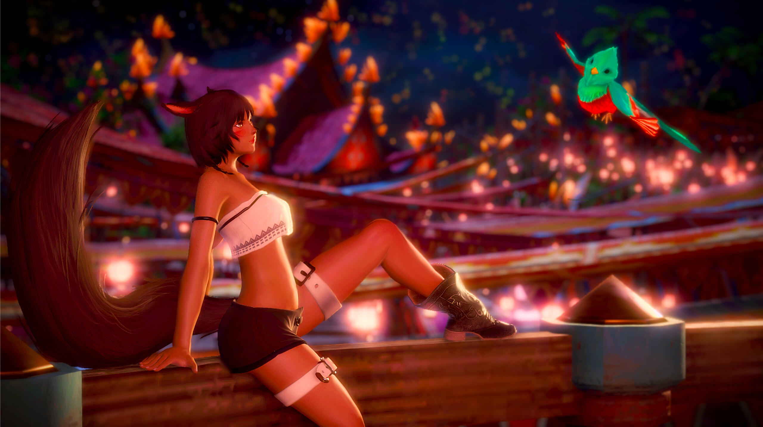While visiting Dock Poga you might note a figure clad in Pelupelu garb and visor, but the bushy tail behind them shows that they're not what they seem. Though she's often seen serving, tending guest quarters, and taking what work she can, Rukh is on the roster of tour guides. Those with the desire (and the pel) might wish to hire her to see the local sights, or even brave the river Ihuykatumu.